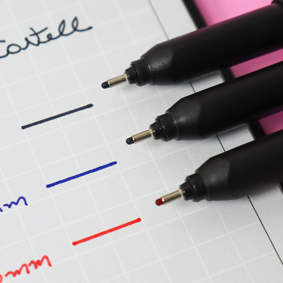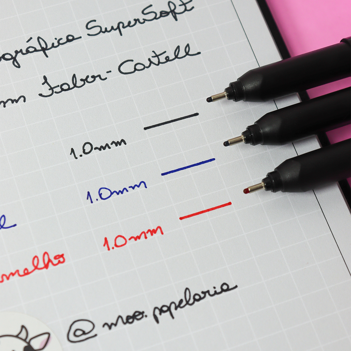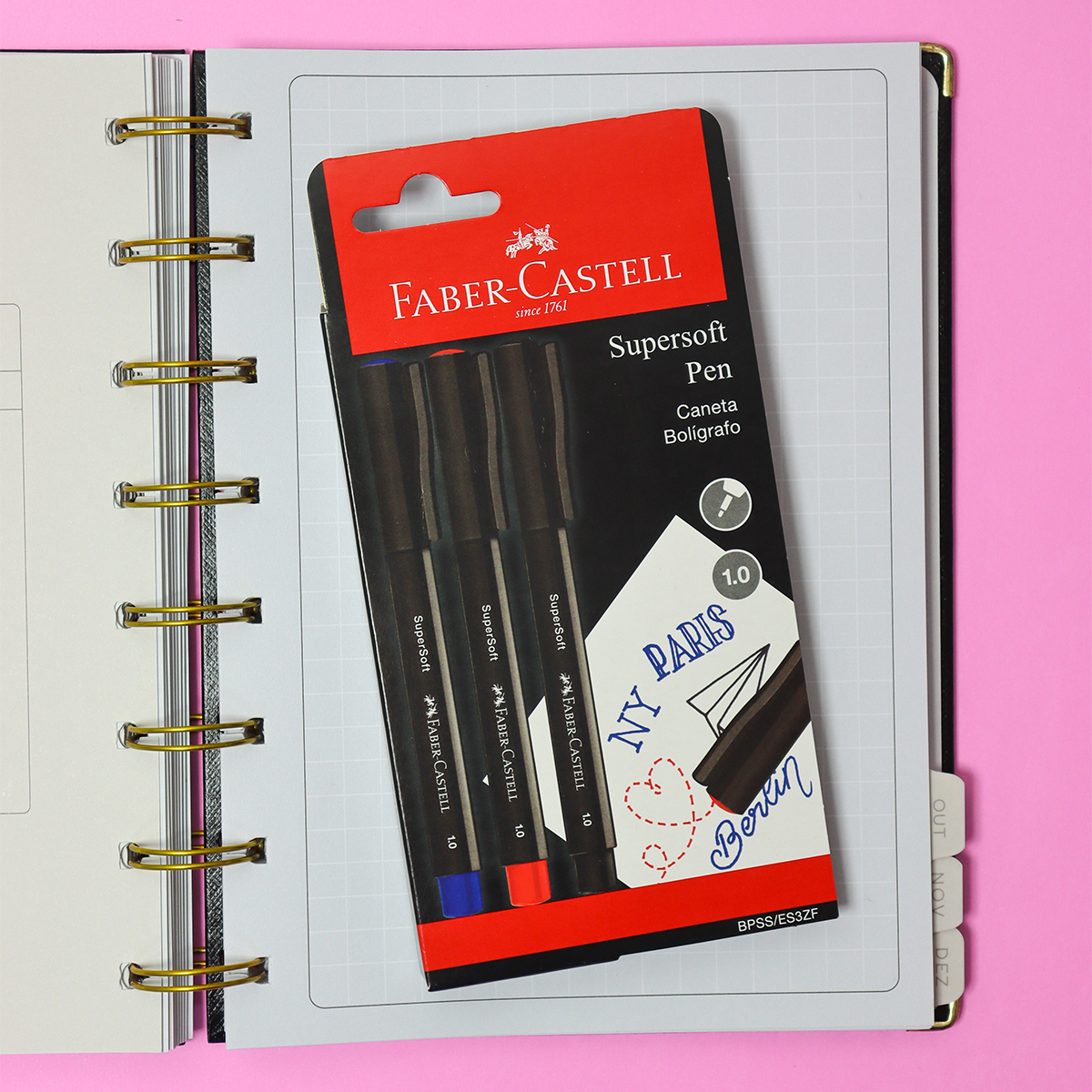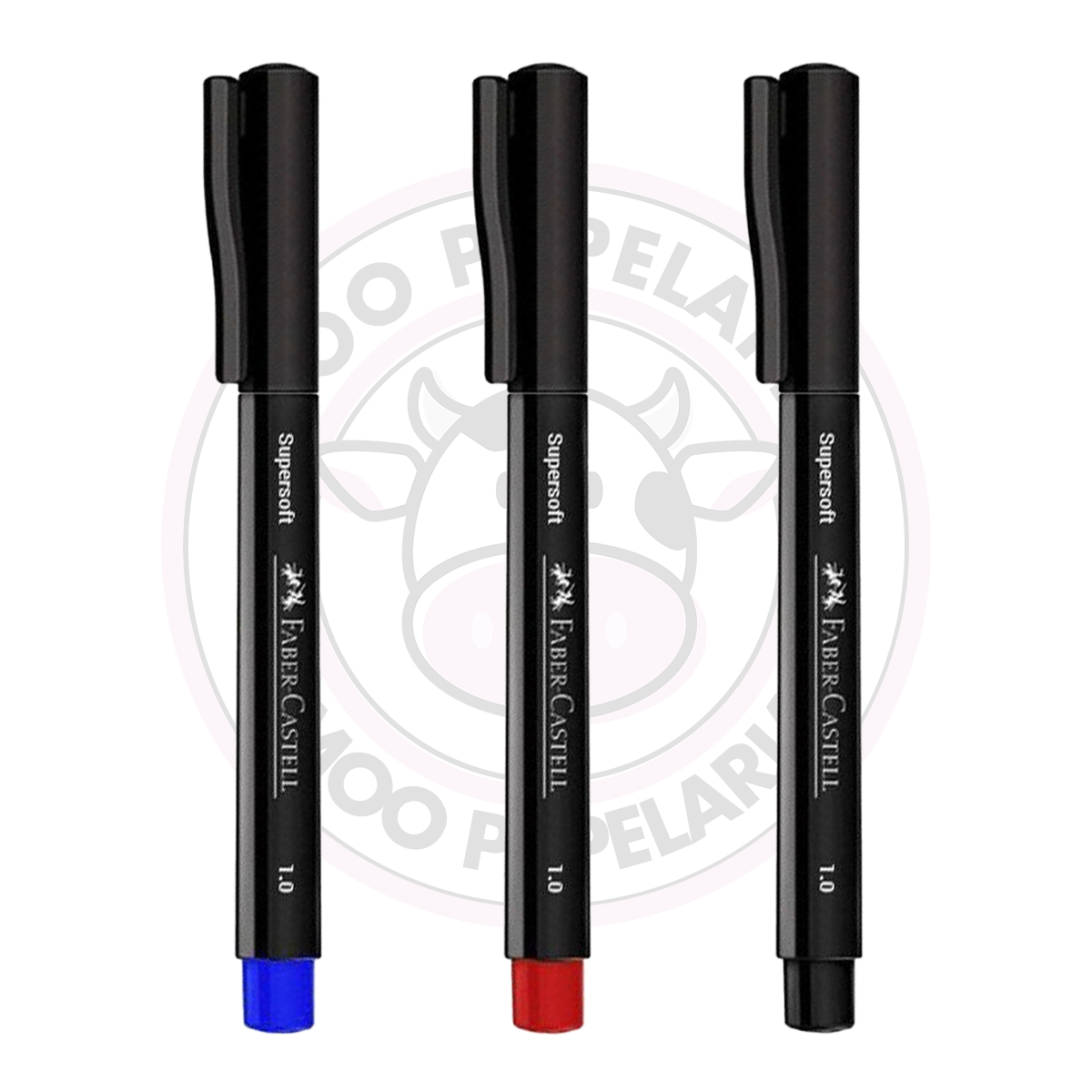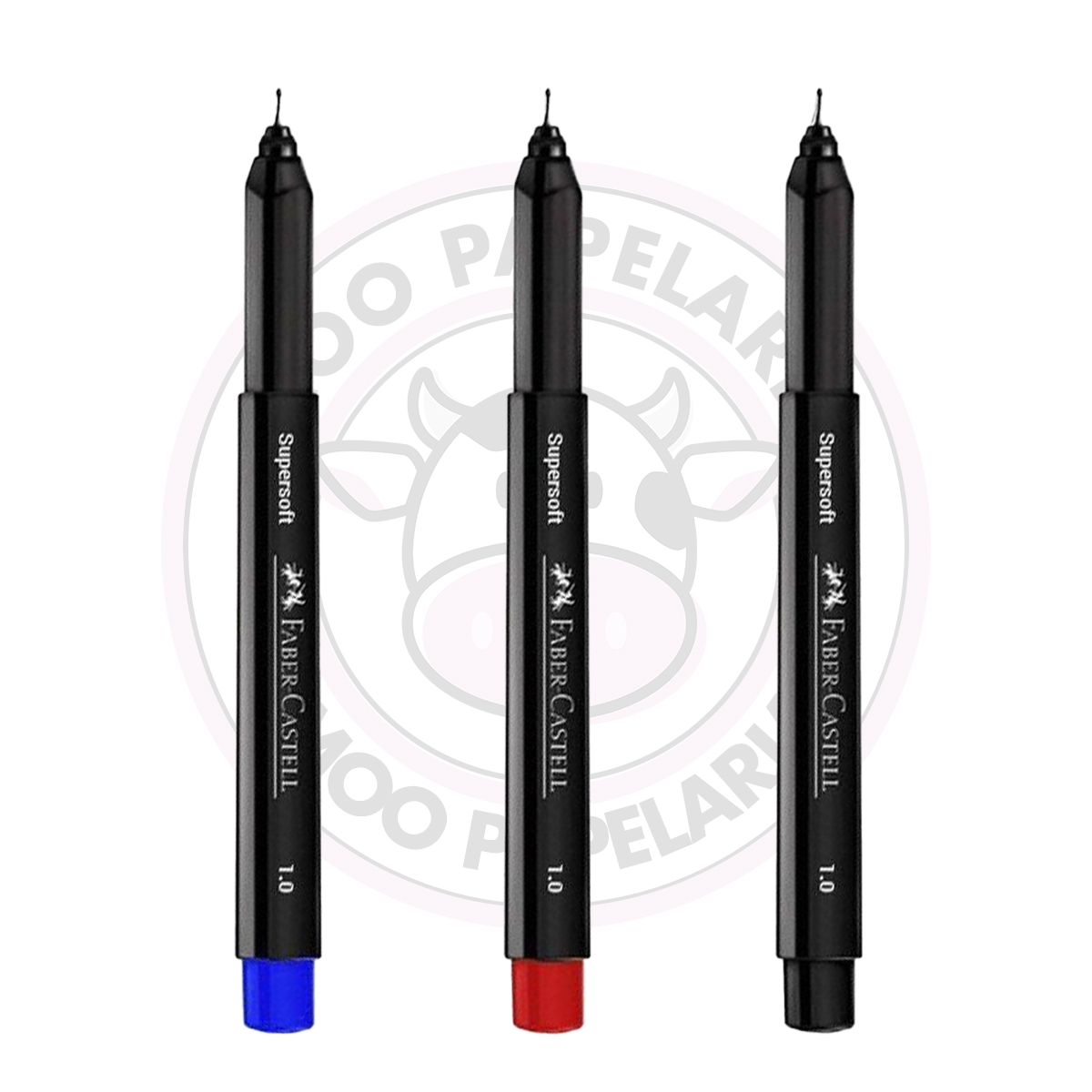 1 Blister da Caneta Hidrográfica SuperSoft Pen 1.0mm Faber-Castell com 3 unidades nas cores: Preto, Azul e Vermelho.