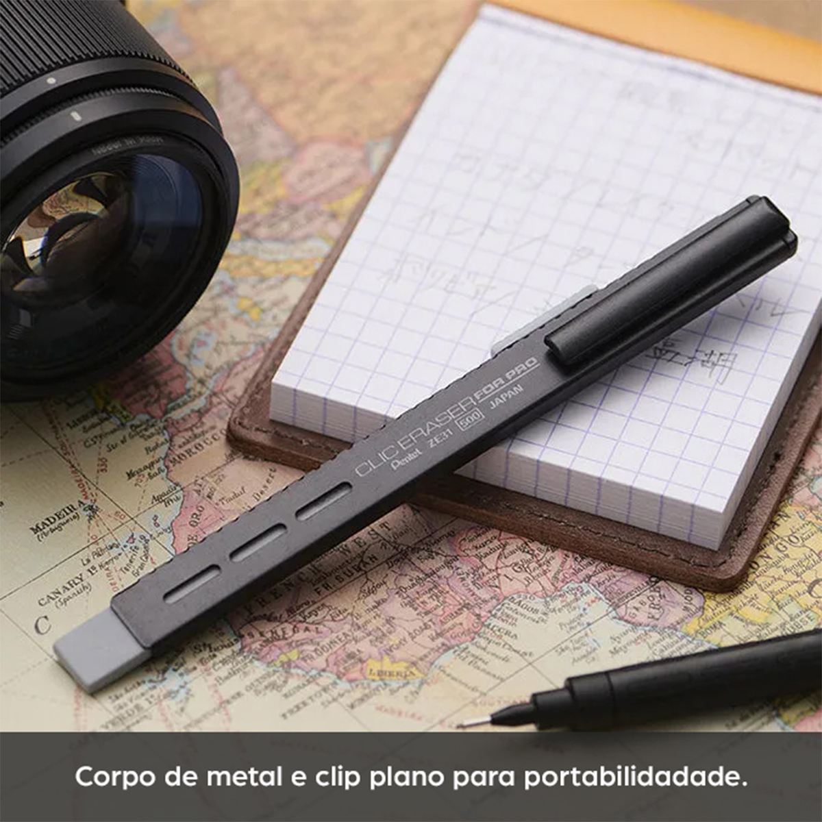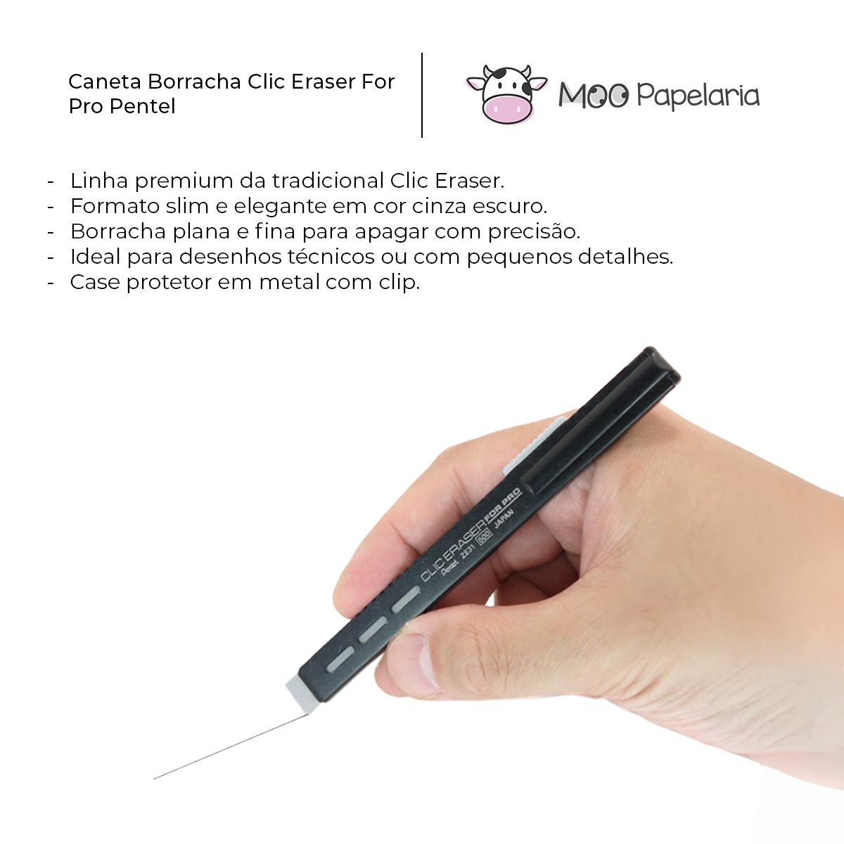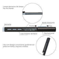A Caneta Retrátil Clic Eraser For Pro Pentel foi desenvolvida para quem exige controle e exatidão ao apagar. Seu design slim aliado à ponta chanfrada permite correções minuciosas com extrema precisão, tornando-se a escolha ideal para desenhos técnicos e estudos detalhados. Uma borracha profissional, prática e confiável.