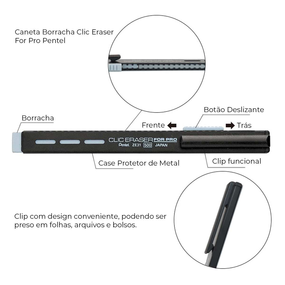 Conteúdo: 1 Blister da Caneta Retrátil Clic Eraser For Pro Pentel.