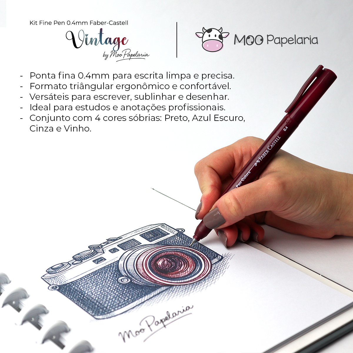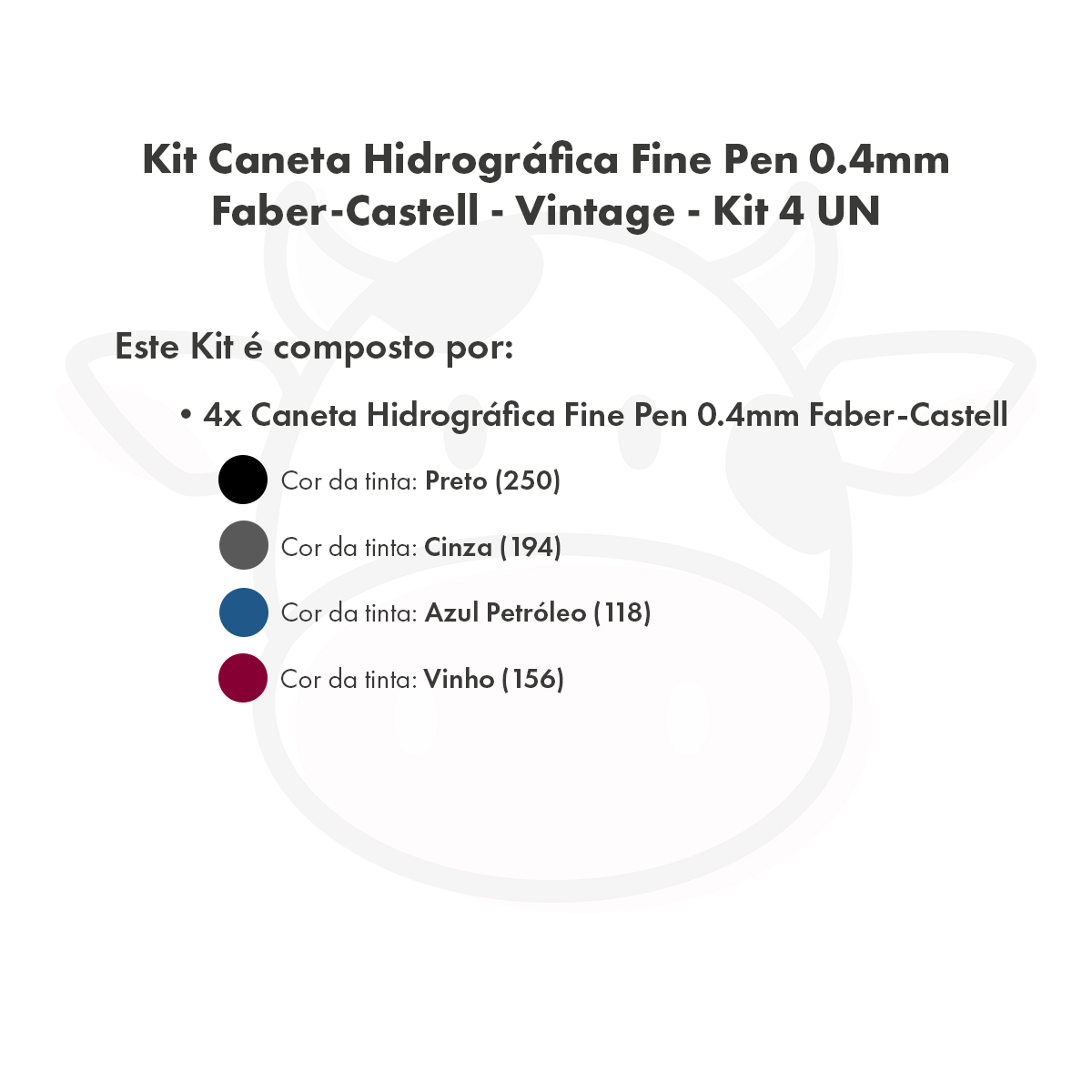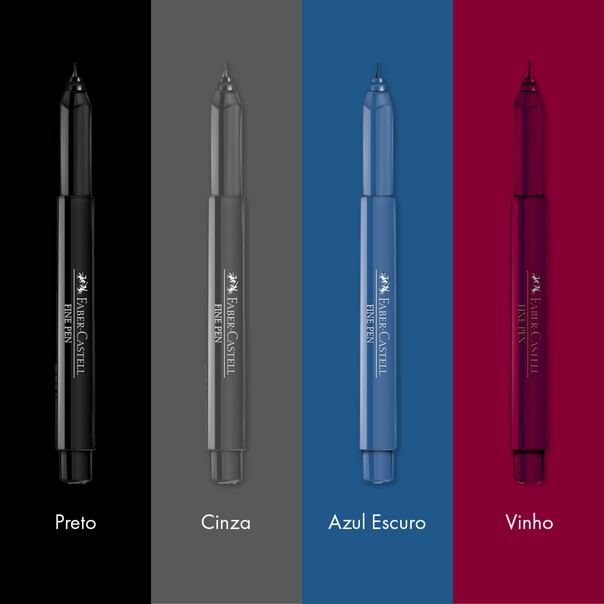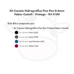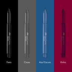 Conteúdo: 1 Kit da Caneta Hidrográfica Fine Pen 0.4mm Faber-Castell com 4 unidades nas cores: Preto (250), Cinza (194), Azul Escuro (118) e Vinho (156).