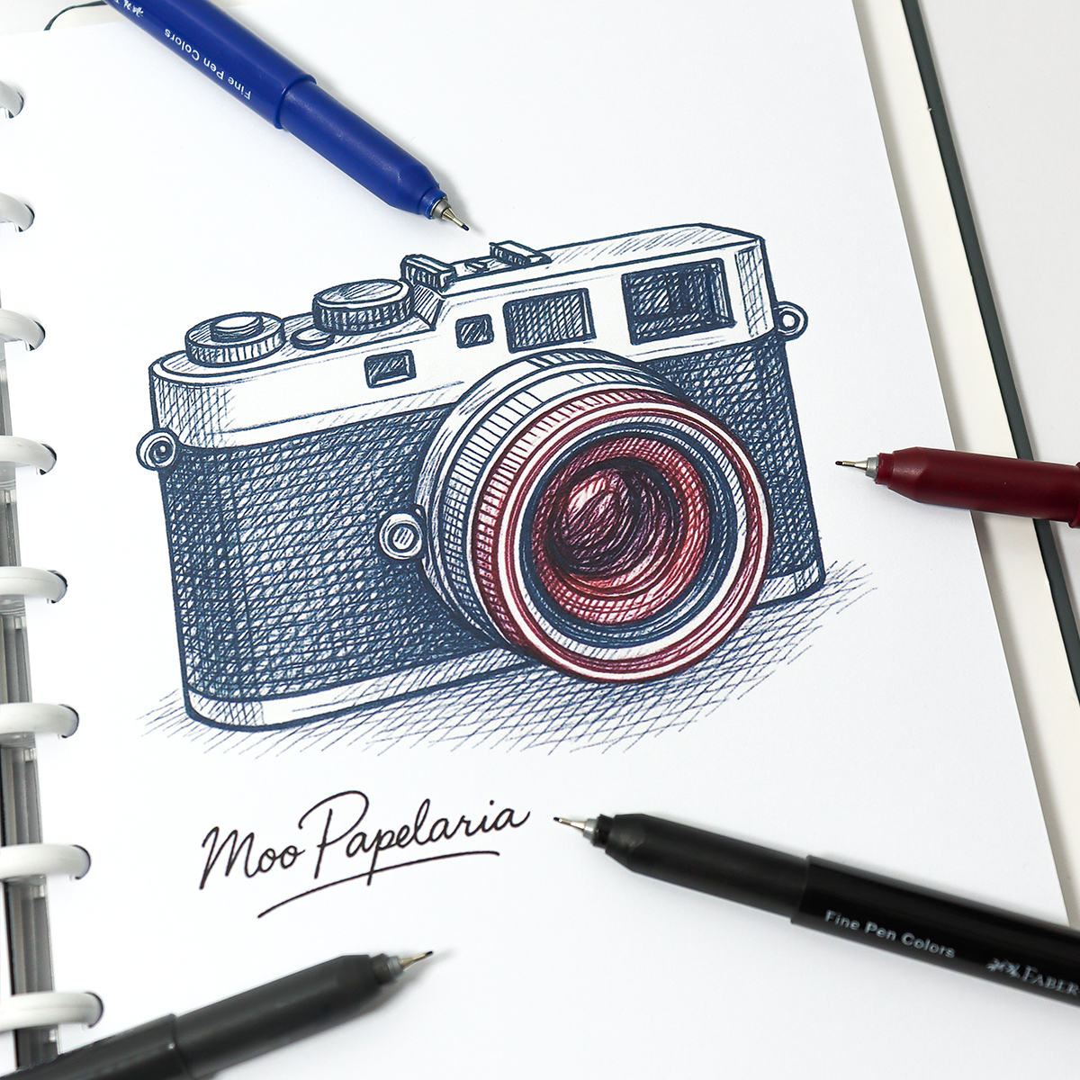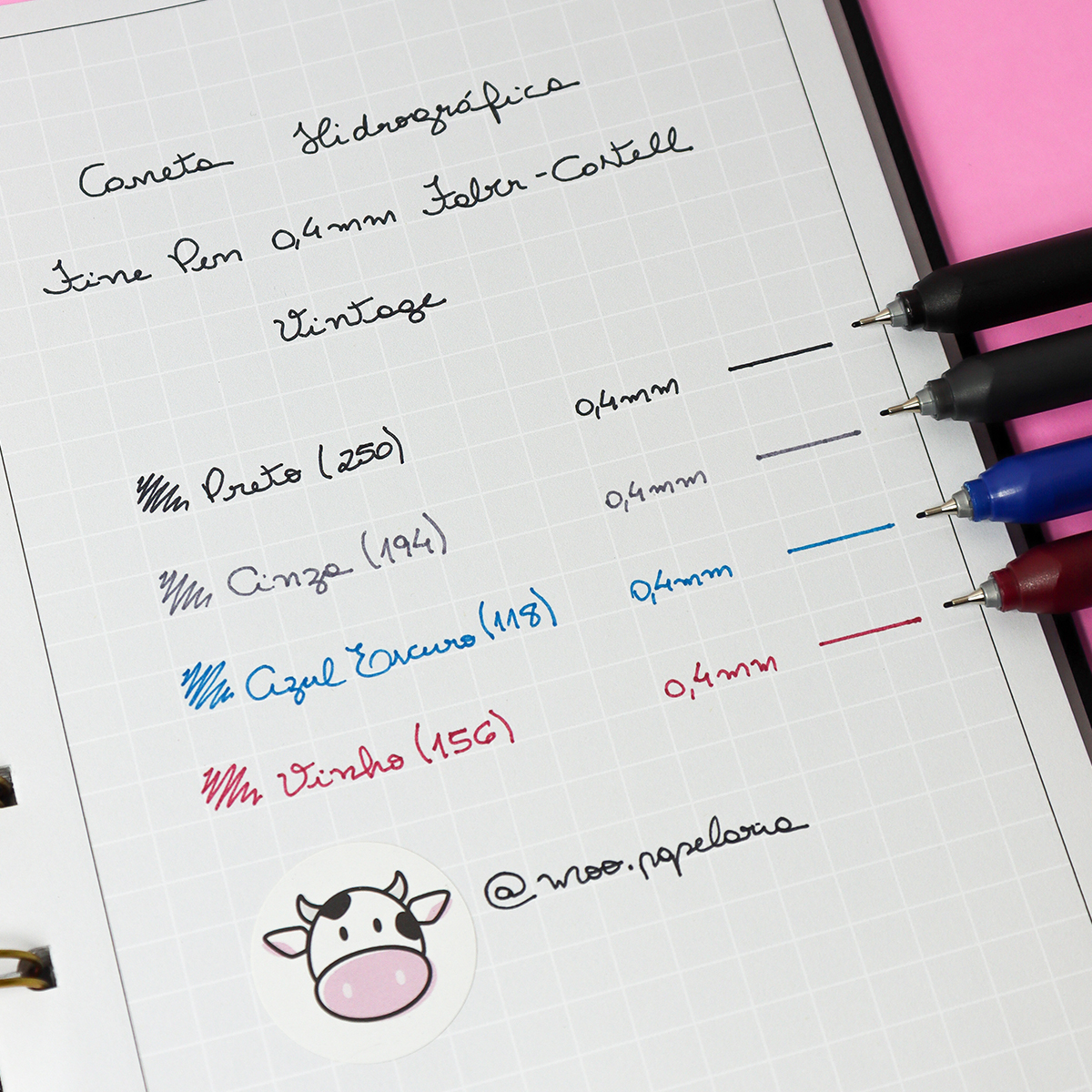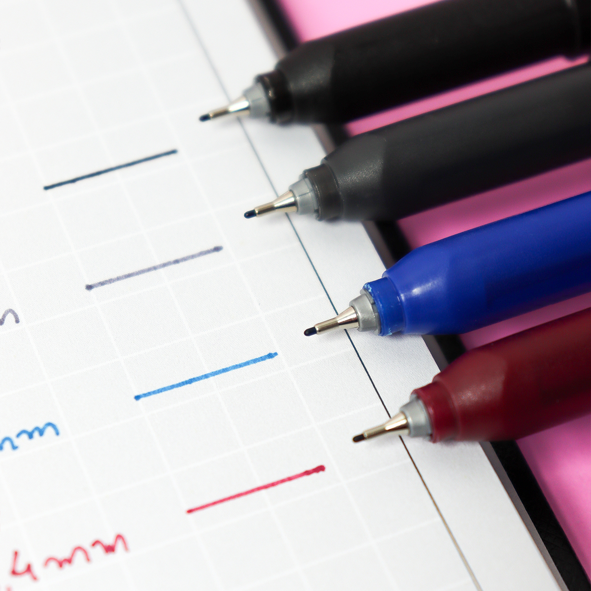 Conteúdo: 1 Kit da Caneta Hidrográfica Fine Pen 0.4mm Faber-Castell com 4 unidades nas cores: Preto (250), Cinza (194), Azul Escuro (118) e Vinho (156).