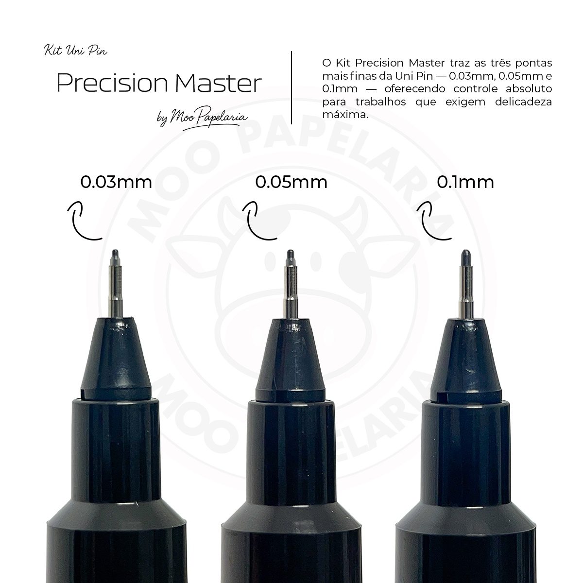 Conteúdo: 1 Kit da Caneta Técnica Uni Pin Fine Line uni-ball – Precision Master – 0.03mm + 0.05mm + 0.1mm