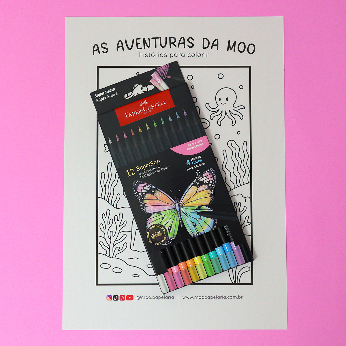 Descubra o novo Estojo de Lápis de Cor SuperSoft Faber-Castell com 12 Cores Pastel, a alta performance que você já conhece, agora com novo sortimento. São 10 Cores Pastel sendo 4 cores novas em relação ao estojo antigo mais um Lápis de Cor Branco e um Lápis de Cor Preto! Explore a versatilidade e o potencial criativo dos lápis SuperSoft Faber-Castell!